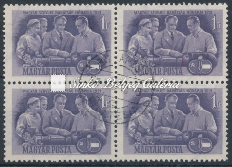 Leírás | 1951. Magyar-Szovjet Barátság - különlegesség 1Ft bélyeg 4-es tömbben a, állású számvízjellel! / 1951. Hungarian-Soviet Friendship - speciality 1Ft stamp in a block of 4 with a, position number watermark! |