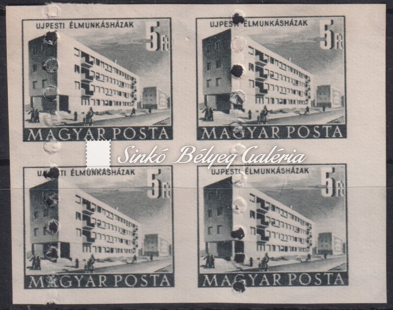 Leírás | 1951/53. Épületek (I.) - tévnyomat 5Ft bélyeg ívszéli 4-es tömbben megsemmisítő lyukasztással! / 1951/53. Buildings (I.) - misprint 5Ft stamp in a block of 4 with annulling cancellation! |