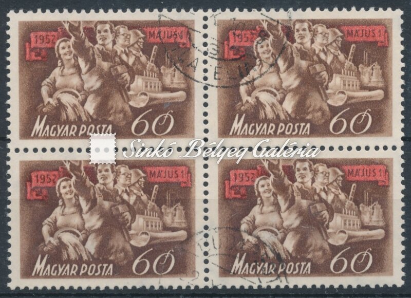 Leírás | 1952. Május 1. (III.) - különlegesség 60f bélyeg 4-es tömbben a, állású számvízjellel! / 1952. 1th of May (III.) - speciality 60f stamp in a block of 4 with a, position number watermark! |