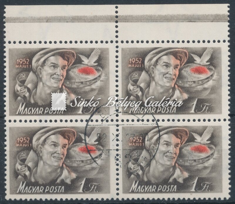 Leírás | 1952. Május 1. (III.) - különlegesség 1Ft bélyeg felső ívszéli 4-es tömbben a, állású számvízjellel! / 1952. 1th of May (III.) - speciality 1Ft stamp in a block of 4 from the upper margin of the sheet with a, position number watermark! |