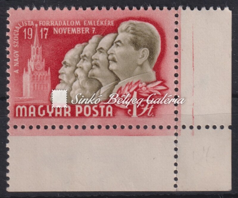Leírás | 1952. Nagy Októberi Szocialista Forradalom (III.) - különlegesség Ívsarki 1Ft bélyeg a, állású számvízjellel! / 1952. Great October Socialist Revolution (III.) - speciality 1Ft stamp from the corner of the sheet with a, position number watermark! |