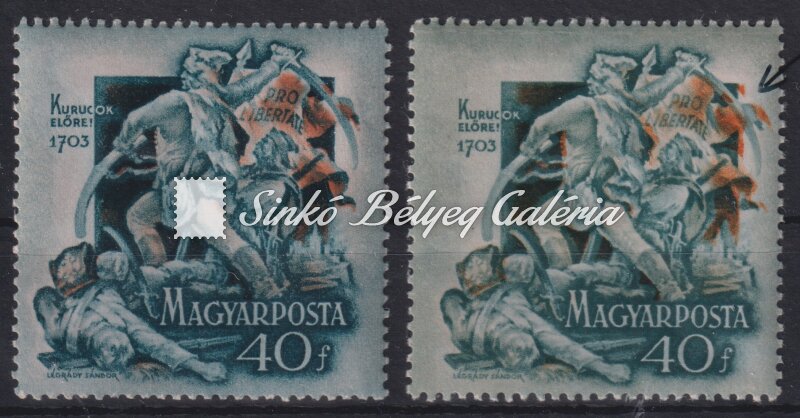 Description | 1953. II. Rákóczi Ferenc (II.) - tévnyomat 40f bélyegen a narancssárga színnyomat jelentős elcsúszása! / 1953. Francis Rakoczi II. (II.) - misprint Significantly slipped orange colour print on 40f stamp! |