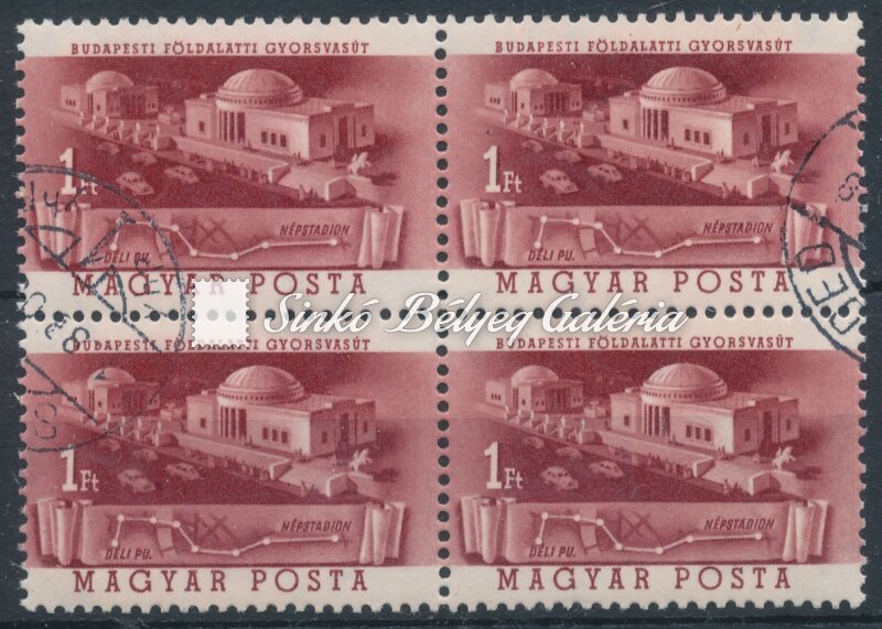 Leírás | 1953. Metró (I.) - különlegesség 1Ft bélyeg 4-es tömbben a, állású számvízjellel. / 1953. Subway (I.) - speciality 1Ft stamp in a block of 4 with a, position number watermark. |