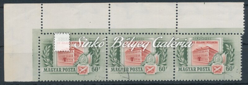 Leírás | 1955. Állami Nyomda (I.) - tévnyomat Ívsarki bélyeg csík szabálytalan fogazattal. / 1955. State Printing House (I.) - misprint Stamp stripe from the corner of the sheet with irregular perforation. |