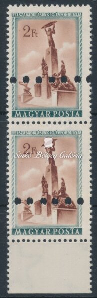 Leírás | 1955. Felszabadulás (III.) - tévnyomat Ívszéli 2Ft bélyegpár megsemmisítő lyukasztással! / 1955. Liberation (III.) - misprint 2Ft stamp pair from the margin of the sheet with annulling punching! |