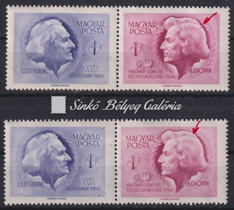 Leírás | 1956. Bélyegnap (29.) - tévnyomat 2db bélyegen Chopin haján folt van! / 1956. Stamp Day (29.) - misprint On 2 stamps, there is a spot on the hair of Chopin! |