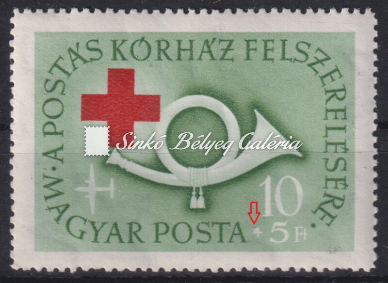 Leírás | 1957. Postáskórház - L - tévnyomat 10(+5)Ft bélyegen fehér folt van az értékszám "+" jelénél! / 1957. Postal Hospital - L - misprint On 10(+5)Ft stamp, there is a white spot by the "+" sign of the denomination! |