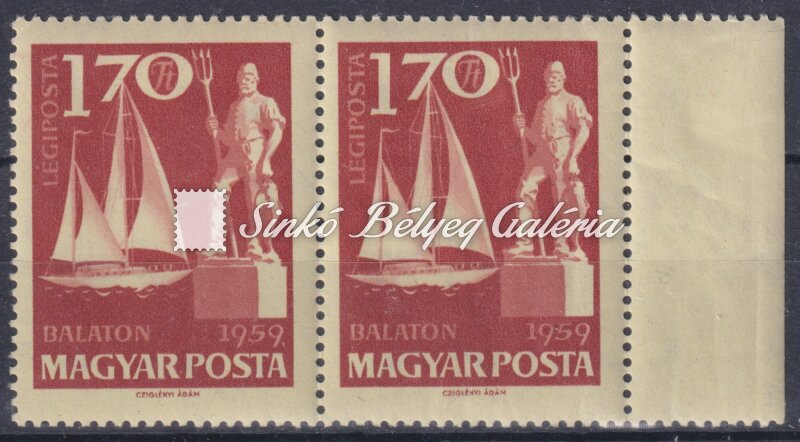 Leírás | 1959. Balaton (I.) - L - tévnyomat Ívszéli 1,70Ft bélyegpáron a hal fején világos folt van! / 1959. Balaton (I.) - L - misprint 1,70Ft stamp pair from the margin of the sheet, on which there is a white spot on the head of the fish! |