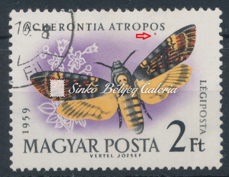Leírás | 1959. Lepke (I.) - L - tévnyomat 2Ft bélyegen az ATROPOS szó második "O" betűje alatt piros pont van! / 1959. Butterfly (I.) - L - misprint There is a red dot below the second letter "O" of the word ATROPOS on 2Ft stamp! |