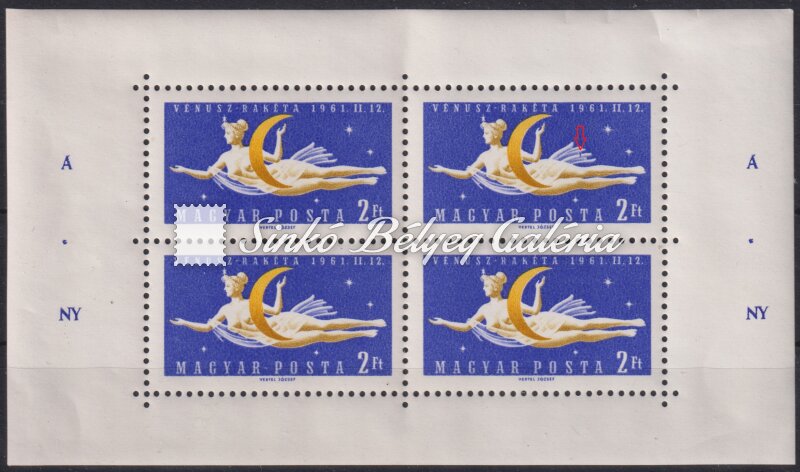 Leírás | 1961. Vénusz-Rakéta kisív - tévnyomat A jobb felső bélyegen szakadt fátyol! / 1961. Venus-Rocket miniature sheet - misprint Torn veil on the upper right stamp! |