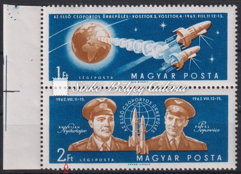 Leírás | 1962. Az első csoportos űrrepülés - L - tévnyomat Ívszéli pár, 2-es számjegyének talpán kis kampó! / 1962. The first group space flight - L - misprint Pair from the margin of the sheet, there is a hook on the feet of the number 2! |