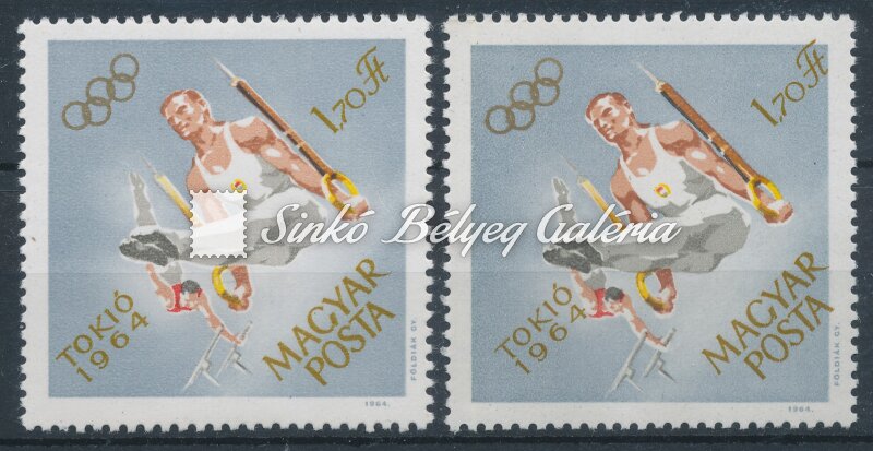 Leírás | 1964. Olimpia (IV.) - Tokió - tévnyomat 1,70Ft bélyegen látványosan elcsúszott az arany színnyomat! / 1964. Olympics (IV.) - Tokyo - misprint Spectacularly slipped gold colour print on 1,70Ft stamp! |