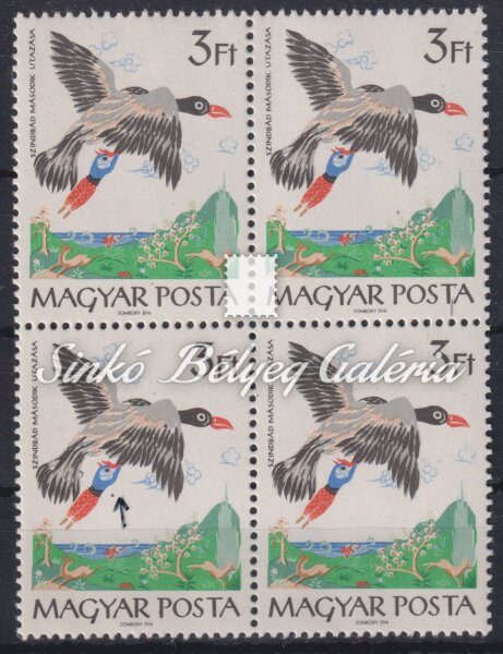 Leírás | 1965. Mese (III.) - tévnyomat 3Ft bélyeg 4-es tömbben, Szindbád mellett fekete folt van! / 1965. Tale (III.) - misprint 3Ft stamp in a block of 4, there is a black spot next to Sindbad! |