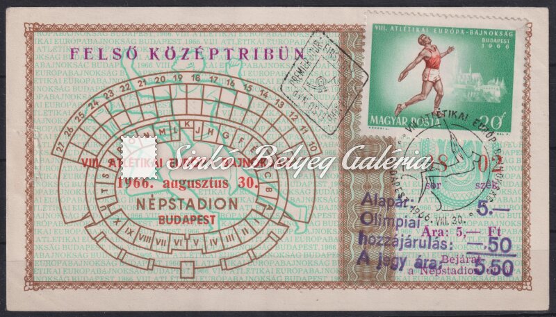 Leírás | 1966. VIII. Atlétikai Európa-Bajnokság Népstadion, Budapest Belépőjegy, elsőnapi és alkalmi bélyegzés 20f bélyegen! / 1966. 8th European Athletics Championships People's Stadium, Budapest Ticket, 20f stamp with first day and occasional cancellation! |