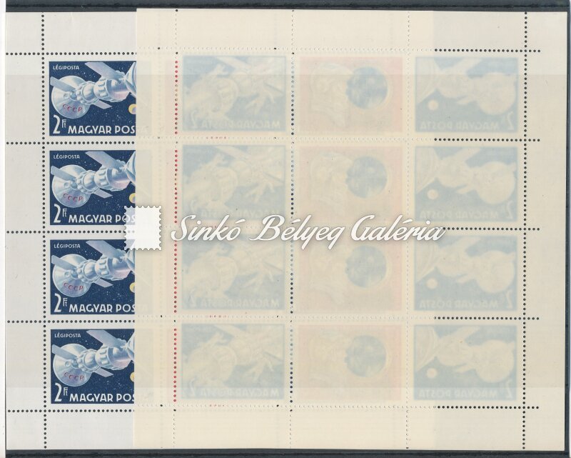 Leírás | 1969. Szojuz 4-5 - L - tévnyomat Kisív gépszínátnyomattal! / 1969. Soyuz 4-5 - L - misprint Miniature sheet with machine set-off! |