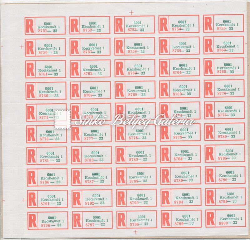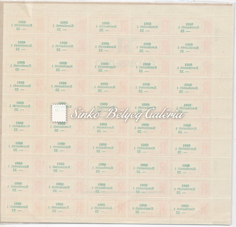 Leírás | 1974. Ragjegy - Nyomdai tévnyomat Postai 5x10 darabos íven a zöld színnyomat eltolódott! / 1974. Label number - Typographical misprint Shifted green colour print on a postal 5x10 sheet! |