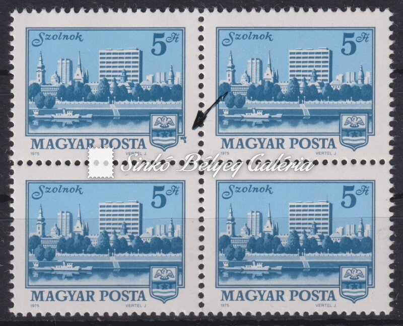Leírás | 1975. Tájak-Városok (IV.) - tévnyomat 5Ft bélyeg 4-es tömbben, a bal felső bélyegen repülő madárhoz hasonlító lemezhiba! / 1975. Landscapes-Cities (IV.) - misprint 5Ft stamp in a block of 4, on the upper left stamp there is a flying bird-like plate failure! |