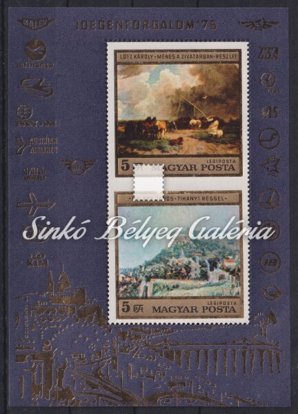 Description | 1976. Festmény (XV.) - Idegenforgalom (I.) - Blokk - tévnyomat Alul az "IDEGENFORGALOM 76" felirat negatív felülnyomata! Katalógus érték: 25.000 HUF / 1976. Paintings (XV.) - Tourism (I.) - Block - misprint With the negative overprint of "IDEGENFORGALOM 76" (TOURISM) below! Catalogue value: 25.000 HUF |