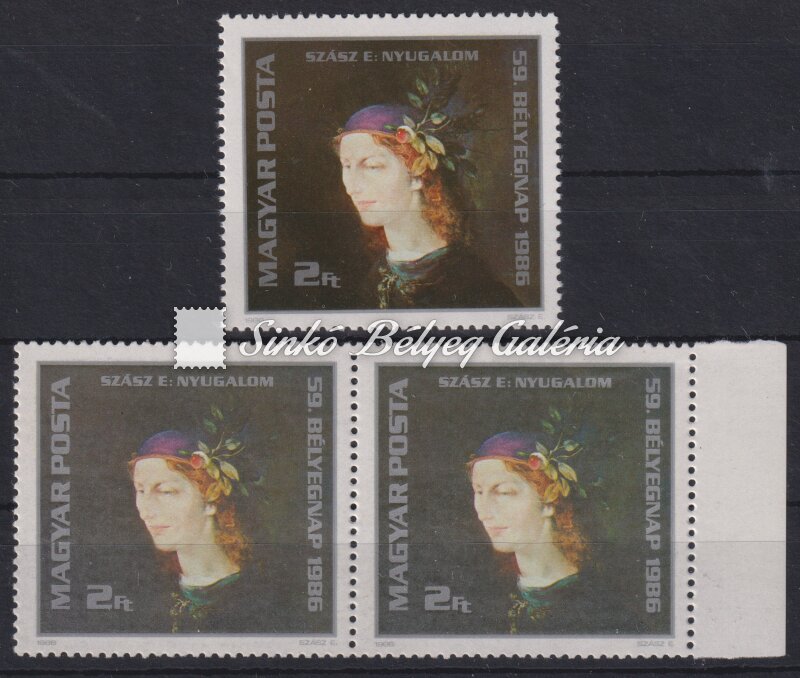 Description | 1986. Bélyegnap (59.) - Festmények (XX.) - tévnyomat Ívszéli bélyegpár ezüstszürke fedő színnyomattal! (Visnyovszki G. tanusítvánnyal!) / 1986. Stamp Day (59.) - Paintings (XX.) - misprint Stamp pair from the margin of the sheet, with silver-grey cover colour print! (With G. Visnyovszki's certification!) |