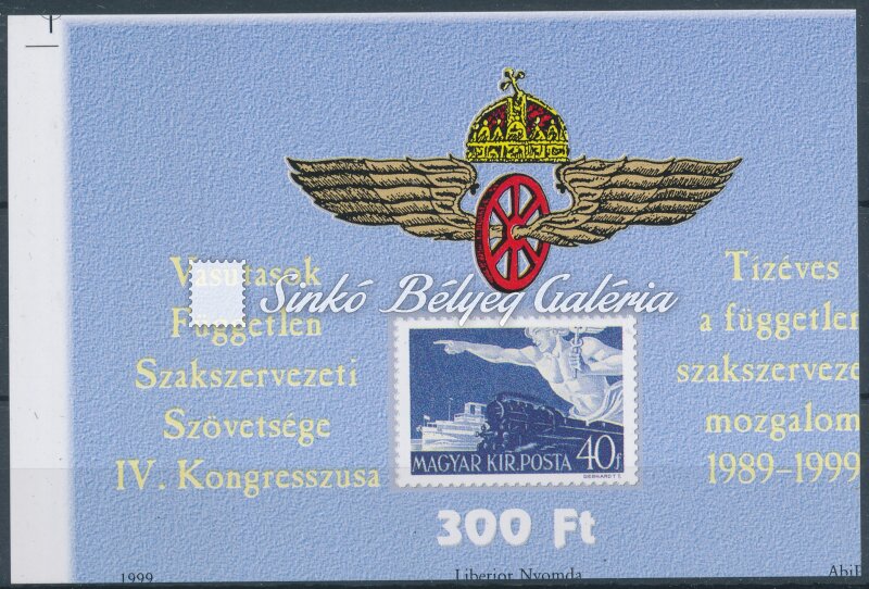 Leírás | 1999. Vasutas Szakszervezeti Kongresszus - emlékív - tévnyomat Képbe vágott bélyeg! / 1999. Railway Trade Union Congress - commemorative sheet Stamp cut into the picture! |