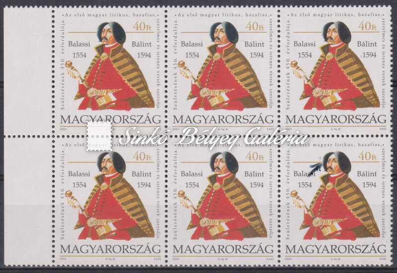 Leírás | 2004. Jeles Magyarok (III.) - tévnyomat 40Ft bélyeg 6-os tömbben, benne a tévnyomat festék foltok vannak a jobb szemen a haj mellett! / 2004. Famous Hungarians (III.) - misprint 40Ft stamp in a block of 6, there are paint spots on the right eye next to the hair! |