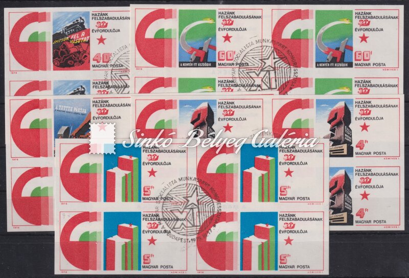 Leírás | 1975. Felszabadulás (VI.) Vágott 4-es tömbben "A Magyar Posta Ajándéka" hátoldali felirattal! Alkalmi bélyegzővel! / 1975. Liberation (VI.) Imperforate blocks of 4. With the subtitle "Gift of the Hungarian Post Office" on the backside! With occasional cancellation! |
