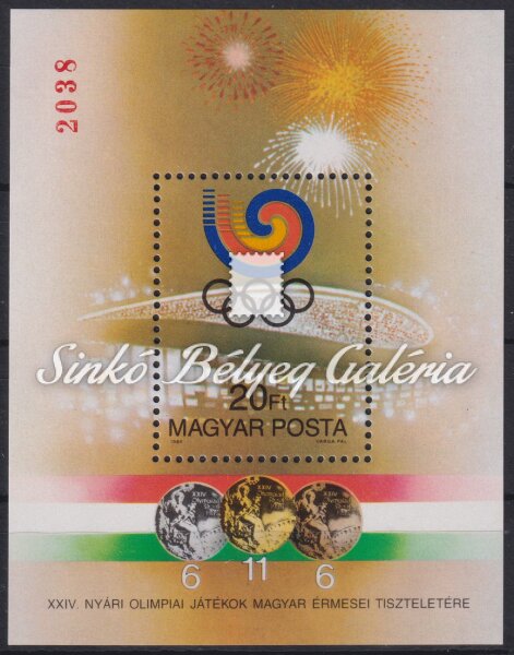 Leírás | 1988. Olimpiai érmesek (V.) - Szöul - Blokk "A Magyar Posta Ajándéka" hátoldali felirattal. / 1988. Olympic Medalists (V.) - Seoul - Block With the subtitle "Gift of the Hungarian Post Office" on the backside. |