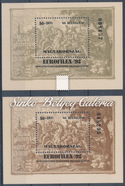 Leírás | 1992. Bélyegnap (65.) - Eurofilex - Blokk A Magyar Posta által a Kiállításon árusított eltérő színű blokk. Katalógus érték: 18.000 HUF / 1992. Stamp Day (65.) - Eurofilex - Block Block in different colours, sold by the Hungarian Post Office at the Exhibition. Catalogue value: 18.000 HUF |