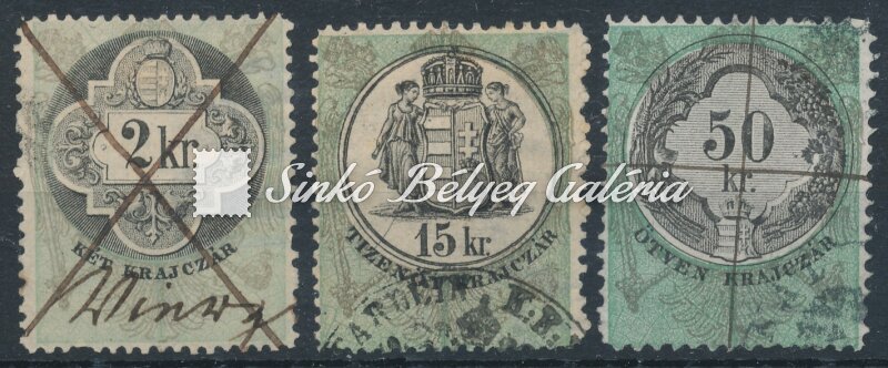 Leírás | 1868. Határőrvidék illetékbélyegek 2kr, 15kr 12-es fogazattal, vízjellel és 50kr 11-es fogazattal. / 1868. Military Border District revenue stamps 2kr, 15kr stamps with 12 perforation and watermark, and 50kr stamp with 11 perforation. |
