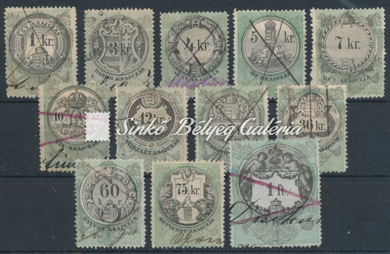 Leírás | 1868. Határőrvidék illetékbélyegek 12db bélyeg 12-es fogazattal. Katalógus érték: 41.500 HUF / 1868. Military Border District revenue stamps 12 stamps with 12 perforation. Catalogue value: 41.500 HUF |