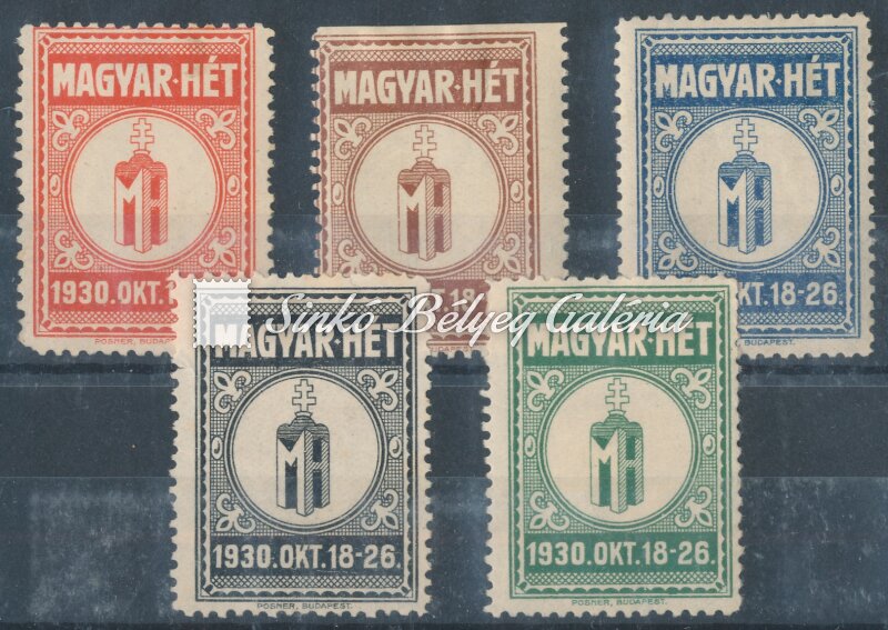 Description | 1930. Magyar Hét - 5db különböző színű levélzáró / 1930. Hungarian Week - 5 cinderellas in different colours |