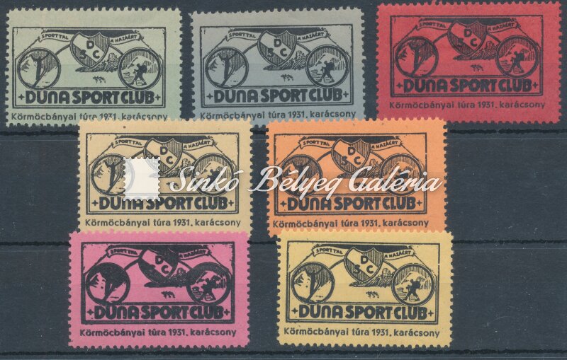 Leírás | 1931. Duna Sport Club - Körmöcbányai túra - 7db levélzáró különböző színben / 1931. Danube Sport Club - Tour of Körmöcbánya - 7 cinderellas in different colours |