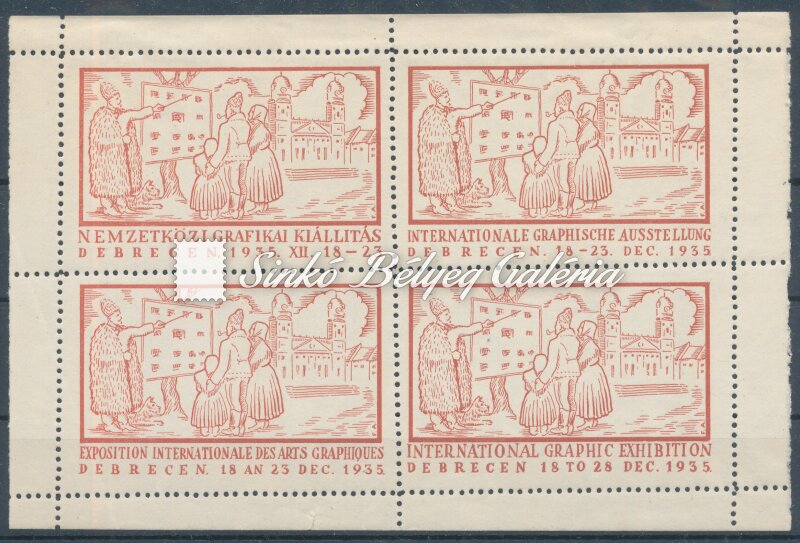 Description | 1935. Nemzetközi Grafikai Kiállítás Debrecen - kisív fehér papíron / 1935.International Graphic Design Exhibition Debrecen - miniature sheet on white paper |