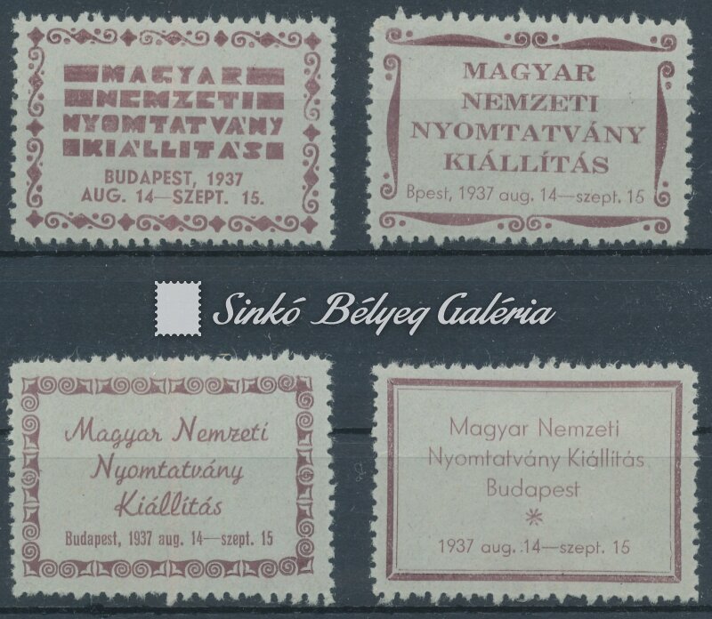 Description | 1937. Magyar Nemzeti Nyomtatvány Kiállítás - 4db levélzáró / 1937. Hungarian National Print Exhibition - 4 cinderellas |