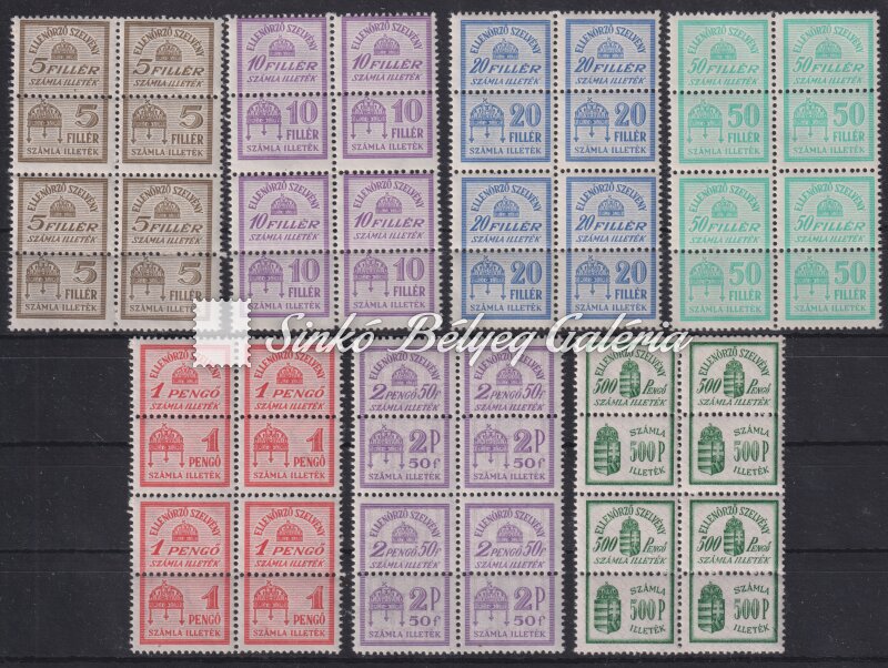 Leírás | 1944/46. Számla Illetékbélyegek 7 különböző értékű 4-es tömb! / 1944/46. Invoice Duty stamps 7 different values in blocks of 4! |