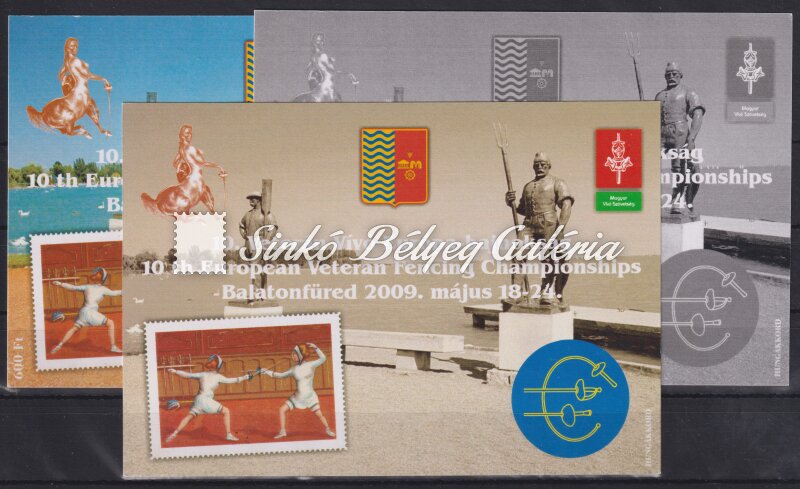 Description | 2009/31. 10. Vaterán Vívó Európa-bajnokság Balatonfüred 2009 - emlékív garnitúra / 2009/31. 10th Veteran European Fencing Championships Balatonfüred 2009 - commemorative sheet set |