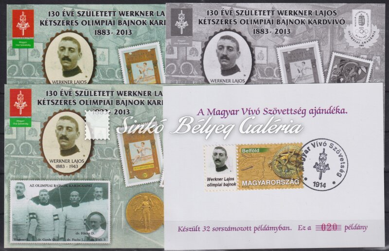 Leírás | 2013. 130 éve született Werkner Lajos kétszeres olimpiai bajnok kardvívó - emlékív garnitúra / 2013. Lajos Werkner, two-time Olympic champion fencer, was born 130 years ago - commemorative sheet set |