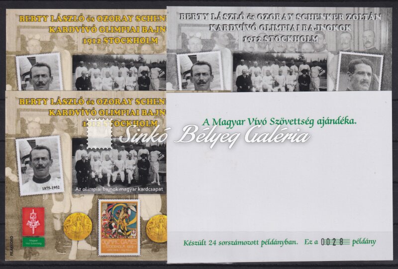 Leírás | 2015. Berty László és Ozoray Schenker Zoltán kardvívó olimpiai bajnokok 1912. Stockholm - emlékív garnitúra / 2015. Laszlo Berty and Zoltan Ozoray Schenker are Olympic fencing champions 1912 Stockholm - commemorative sheet set |