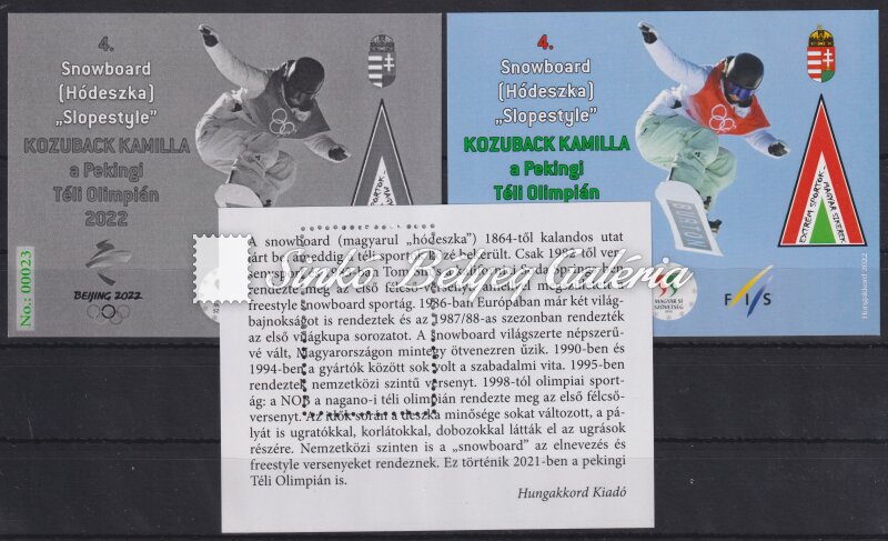 Leírás | 2022. 4. SNOWBOARD (hódeszka) "Slopestyle" Kozuback Kamilla a Pekingi Téli Olimpián 2022 - emlékív garnitúra / 2022. 4. SNOWBOARD "Slopestyle" Kamilla Kozuback at the Beijing Winter Olympics 2022 - commemorative sheet set |