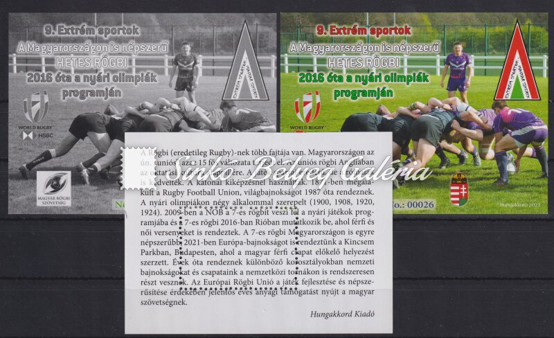Leírás | 2022. 9. A Magyarországon is népszerű HETES RÖGBI 2016 óta a nyári olimpiák programján - emlékív garnitúra / 2022. 9. RUGBY SEVENS, also popular in Hungary, has been on the Summer Olympics programme since 2016 - commemorative sheet set |