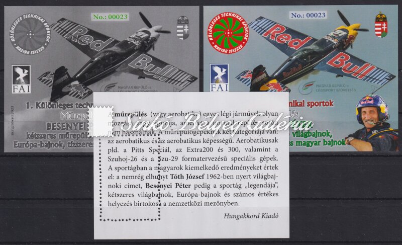 Leírás | 2023. 1. MŰREPÜLÉS Besenyei Péter kétszeres műrepülő világbajnok, Európa-bajnok, tízszeres magyar bajnok - emlékív garnitúra / 2023. 1. AEROBATICS Peter Besenyei two-time aerobatic world champion, European champion, ten-time Hungarian champion - commemorative sheet set |