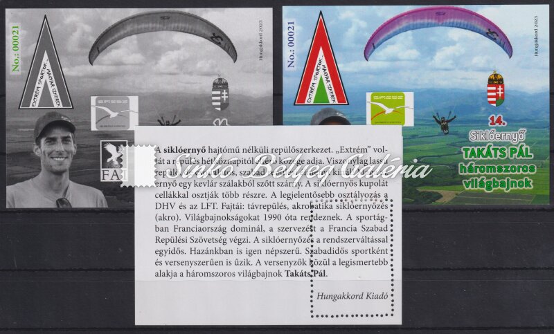 Description | 2023. 14. SIKLÓERNYŐ Takács Pál háromszoros világbajnok - emlékív garnitúra / 2023. 14. PARAGLIDER Pal Takacs three-time world champion - commemorative sheet set |