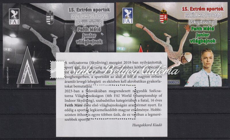 Leírás | 2023. 15. Szélcsatorna (Skydiving) Feith Máté junior világbajnok - emlékív garnitúra / 2023. 15. Wind Tunnel (Skydiving) Mate Feith junior world champion - commemorative sheet set |