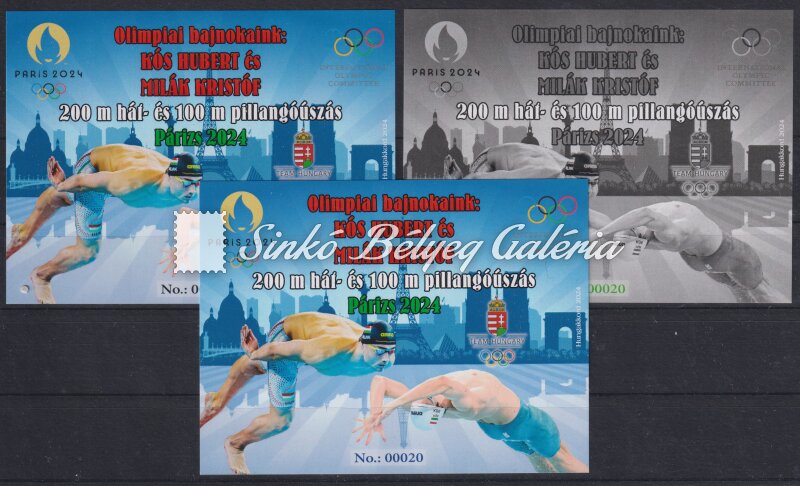 Leírás | 2024. Olimpiai Bajnokaink: Kós Hubert és Milák Kristóf - 200 m hát és 100 m pillangó úszás - Párizs 2024 - emlékív garnitúra (3db) azonos sorszámmal! / 2024. Our Olympic Champions: Hubert Kos and Kristof Milak - 200 m backstroke and 100 m butterfly - Paris 2024 - commemorative sheet set (3 pieces) with identical serial numbers! |